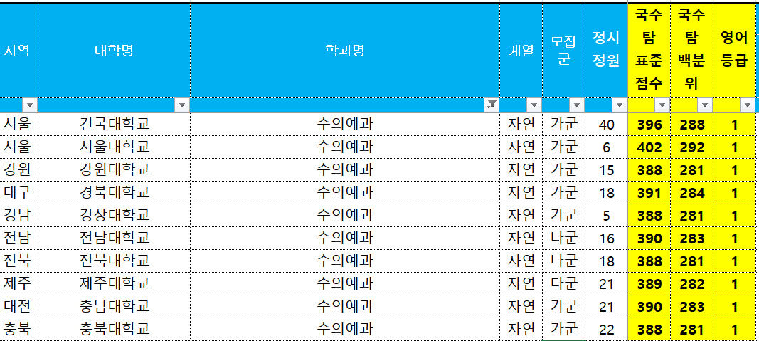 2021년도 대성학원 정시배치표 기준으로는 서울대 수의예과는 표준점수 402점, 건국대는 396점, 경북대 391, 전남대, 충남대는 390점대로 예상되었으며 가장 낮은 점수대도 388점대로 차이가 거의 없을 정도입니다.