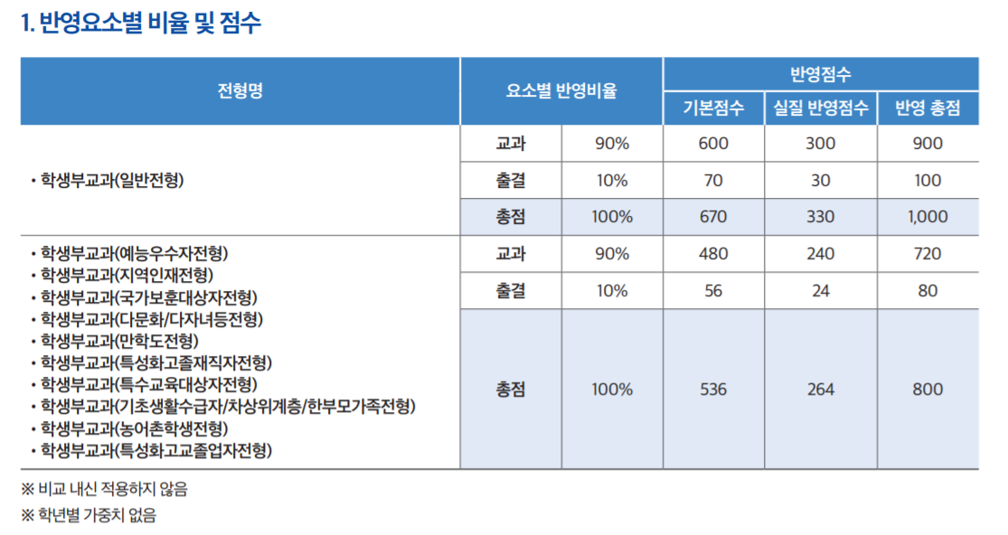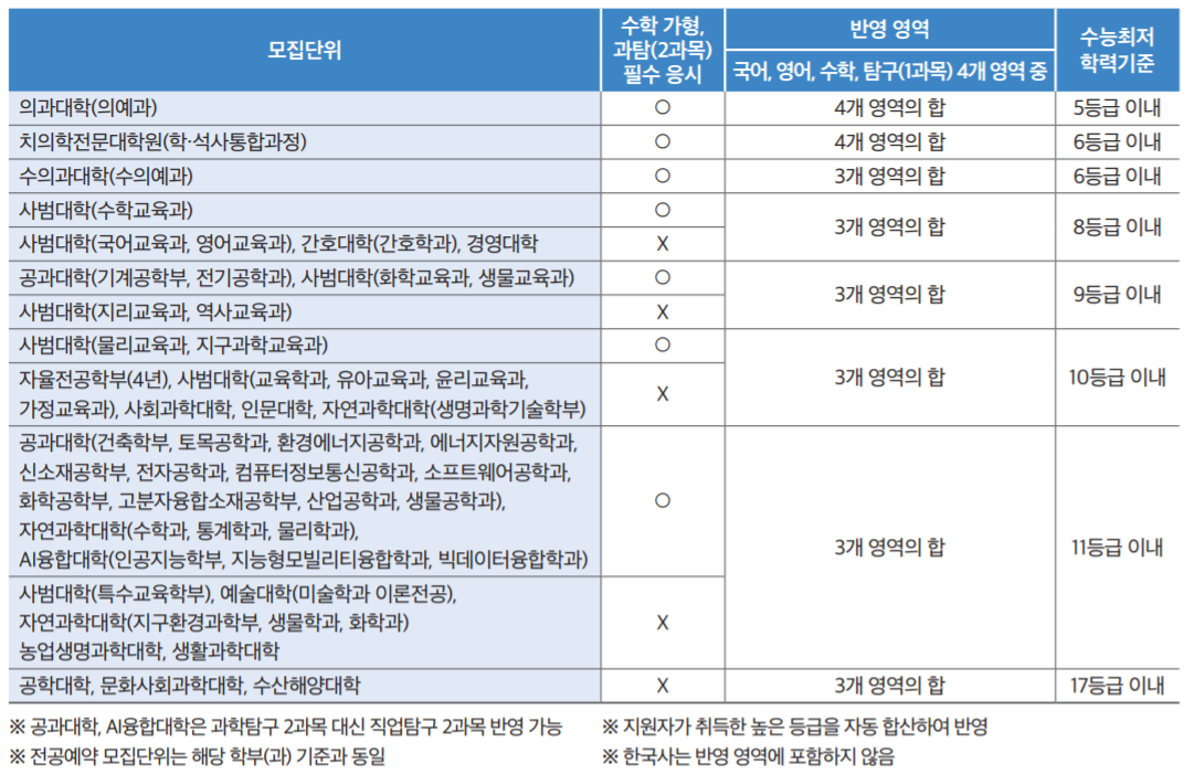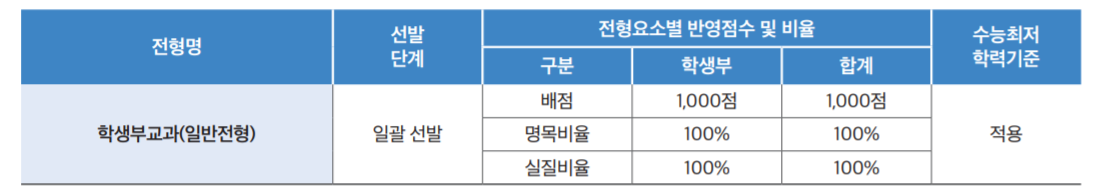 학생부 교과는 일반전형으로 1,468명 등 총 2,030명을 선발합니다. 일반 전형만 서류 100%를 통하여 전형을 실시하며 다른 학생부교과 전형은 1단계 서류 평가후 2단계에서 1단계 성적 80%, 면접 20%를 반영합니다. 학생부교과 일반전형과 예능우수자 전형은 수능최저학력기준을 적용합니다. 다른 학생부 교과 전형은 수능최저학력기준은 없습니다. 주요 기준을 보면 자율전공학부(4년), 사범대학(교육학과, 유아교육과, 윤리교육과, 3개 영역의 합 10등급 이내 가정교육과), 사회과학대학, 인문대학, 자연과학대학(생명과학기술학부)는 국어, 영어, 수학, 사탐,과탐 4개 과목중 3개 영역 등급합 10등급 이내입니다. 공과대학 건축학부 등은 11등급이내, 공과대학 기계, 전기공학부는 9등급 이내 등으로 기준이 다르니 기준을 잘 살펴봐야 하겠습니다.