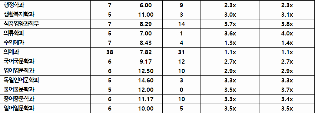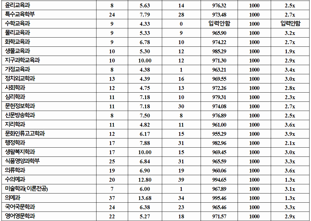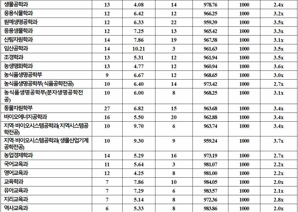 학생부교과 일반전형의 경우 의예과 1.3, 수의예 1.3, 전기공학 1.7, 화학공학부 1.9, 생물교육과 1.9 등으로 평균 등급이 높습니다. 간호학과 2.0, 경영학부 2.9, 국어교육과 2.2, 교육학 2.0, 사회학과 2.8, 신문방송 2.5, 행정 2.1, 음악교육과 2.3 등입니다. 대체로 사범대의 등급이 높은 편입니다. 화공생명공학과, 물류통상학부, 문화콘텐츠학부 등 4~5등급 대의 학과들도 있으니 참고하시면 되겠습니다.