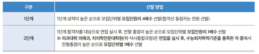 학생부 종합은 지역인재전형 641명, 고교생활우수자전형 476명, 후계농업경영인전형 8명, 조기취업형계약학과 전형 84명 등 총 1,209명을 선발합니다. 의예과를 제외한 모든 모집단위에서 수능최저학력기준은 적용하지 않습니다. 제출 서류는 학교생활기록부만 제출하며 자기소개서는 제출하지 않습니다. 1단계 서류 평가로 4배수를 선발하고 2단계에서 1단계 성적 70%, 면접 30% 비율로 반영합니다.