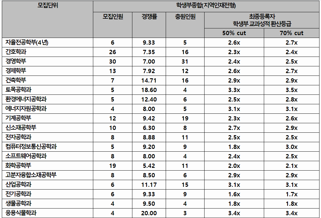 학생부종합의 주요 학과를 살펴보면 70%컷기준, 전기공학과 1.7, 생물공학과 1.8, 경제학부 2.7, 화학공학부 2.1, 정치외교 2.9, 행정 2.3, 의예 1.1, 수의예 1.4, 불어불문 3.7, 수학 2.7, 산업공학 3.1, 기계공학 2.6 등입니다. 전남대의 경우 학생부 교과의 비중도 적지 않은 것으로 보입니다. 물론 정성 평가 기준입니다. 자기소개서가 없는 것을 감안하면 학생부에 누락된 것은 없는지 잘 확인해야 하겠습니다.