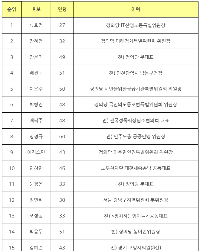 정의당 당선자를 보면 1번 류호정(27세), 2번 장혜영(32), 3번 강은미(49), 4번 배진교(51), 5번 이은주(50)까지 당선되었습니다. 2번 장혜영 당선자는 연세대학교를 자퇴하고 영화감독, 인건 운동가로 활동하다 정의당에 입당하여 이번에 당선되었습니다. 장애인 친동생이 있어 장애인 생활 환경 개선을 위한 장애인 운동가로도 활동하고 있습니다.