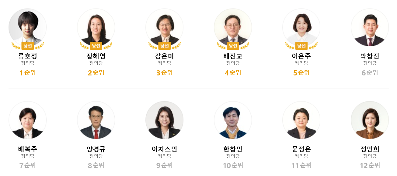 5번 이은주 당선자는 역무원으로 근무하여 노동운동을 했던 경력이 있으며 민노당, 정의당의 당원이기는 했지만 정치 경력은 이번이 처음입니다. 노동 관련 문제에서 목소리를 낼 것으로 기대됩니다.