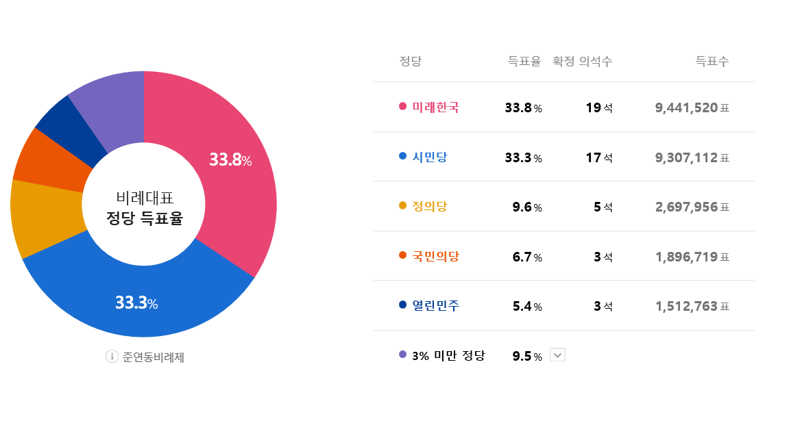 준연동형 비례대표제 도입에 따라 지역구에서 당선자를 많이내기 어려운 정의당 같은 3당, 소수 정당들이 상대적으로 많은 비례 대표를 얻을 수 있었으나 두 거대 정당의 욕심으로 인하여 과거와 똑 같은 결과를 받고 말았습니다. 여러 언론이나 기관에서 분석을 내놓았는데 대체로 위성 정당이 없었다면 정의당이 이번에 받은 득표수와 득표율을 근거로 하면 최대 16석까지도 가능했다고 하니 정의당으로서는 매우 안타까운 상황일 것 입니다.