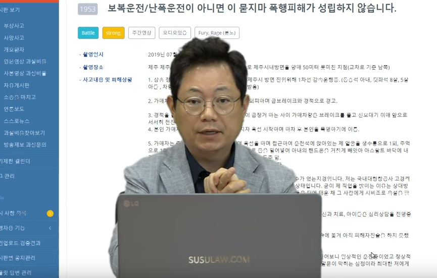 이렇게 그냥 묻힐 뻔했던 사건은 유튜브 채널인 한문철 TV’를 운영하는 한문희 변호사가 유튜브를 통하여 칼치기 항의하는 아빠, 아이들 앞에서 폭행이라는 제목으로 피해 동영상을 공개하며 세상에 알려졌습니다. 알려진 바에 따르면 관할서인 제주동부경찰서는 사건이 발생한 후에 가해자를 입건하여 조사하였다고 하지만 단순 폭행과 재물손괴 혐의만 적용한 것으로 알려져 더욱 논란을 불러 일으키고 있습니다. 분명히 운전중인 사람을 폭행한 사건(운전 중 신호대기로 멈춤 상태도 운전 중으로 간주)으로 특정범죄가중처벌법을 적용하여 3년 이상의 징역형에 처할 수 있음에도 불구하고 왠 일인지 단순폭행으로 마무리하고 하려 했다는 의심이 드는 것입니다.