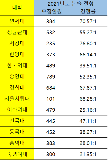주요 대학 중 중앙대가 전체 789명을 모집하여 가장 많은 합격자를 선발합니다. 다음으로 경희대 684명, 성균관대 532명, 한국외대 489명, 이화여대 479명 순입니다. 상대적으로 주요 대학은 논술 전형 모집 인원이 전체 수시모집에서 약 25% 정도를 차지하고 있어 상위권 대학을 노리는 수험생들에게는 놓칠 수 없는 기회이기도 합니다. 그만큼 경쟁률도 매우 치열합니다. 주요대학의 경쟁률을 살펴 보면 연세대는 70.57:1, 건국대 47.11:1, 동국대 38.27:1, 홍익대 28.01:1, 숙명여대 21.35:1, 서강대 76.80:1, 서울시립대 68.28:1, 성균관대 55.27:1, 이화여대 25.16:1, 중앙대 52.35:1, 한국외대(서울) 39.51:1, 한양대 66.14:1, 경희대 67.87:1 등입니다. 연세대학교의 논술 전형 경쟁률이 큰 폭으로 뛰었는데 논술 전형 일자를 수능 시험 이후로 변경한 것이 큰 영향을 준 것으로 분석되고 있습니다. 주요 대학 중 수능 이전에 논술을 실시하는 대학은 서울시립대와 홍익대로 각각 10월 24,25일에 치러질 예정입니다.