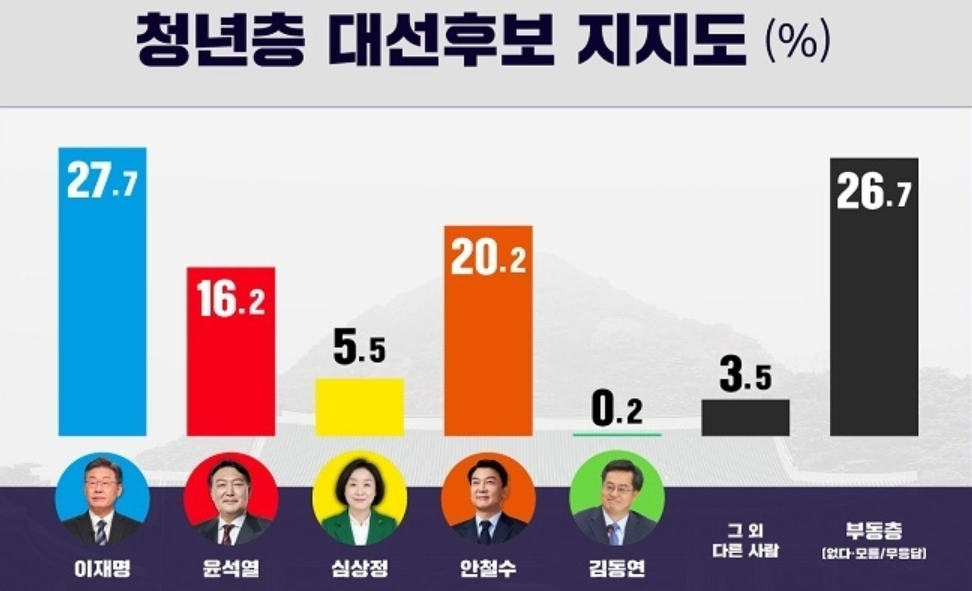 대통령 선거일이 60일도 채 남지 않으면서 여론조사 결과가 쏟아져 나오고 있습니다. 이제 진짜 본격적인 대선 무대의 막이 오른 것으로 보입니다. KBS는 최근 모든 세대가 아닌 젊은 층인 20~30대만을 대상으로 지지율을 조사하여 발표하였습니다. 2030세대의 지지율을 어느 후보가 가져 가는지가 이번 대선의 분수령이 될 것으로 예상되는 만큼 관심이 큰 것 같습니다.