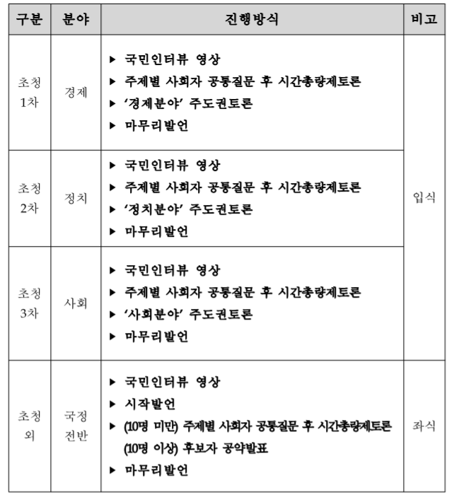토론 방식은 ‘시간총량제토론’과 ‘주도권토론’ 방식으로 진행될 예정입니다. 시간총량제 토론 방식은 지난 19대 대선때 선보였던 방식으로 후보자별로 주어진 발언 시간의 총량 내에서 사회자의 질문에 답변하고 다른 후보자와 자유롭게 토론할 수 있는 방식입니다. 주도권 토론 방식은 그동안 방송사 토론에서 많이 볼 수 있었던 방식으로 주도권을 가진 후보자가 주어진 시간 동안 다른 후보자를 지목해 질문과 답을 주고받는 형식으로 선관위 주관 토론회에서는 처음 도입된 방식으로 후보들의 진면목을 좀더 파악하기 좋은 기회가 될 것입니다. 분야별로 사회자가 2가지 질문을 제시하면 후보자들이 공통으로 답변을 하고 이후 같은 시간으로 주어지는 발언 시간을 이용하여 후보자간 토론이 진행될 수 있습니다. 후보자간 공방이 벌어지는 과정에 후보들의 역량을 볼 수 있을 것입니다. 관심이 큰 선거인 만큼 좀더 횟수가 많으면 좋을 것 같은데 3번의 일정은 다소 짧아 보입니다.
