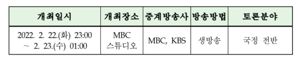 보도 내용에 따르면 주요 후보들의 토론 일정은 2월 21일(월) 경제분야, ,2월 25일(금) 정치분야, 3월 2일(수) 사회분야를 주제로 하여 매회 오후 8시부터 2시간 동안 입식 토론으로 진행될 예정입니다. 주요 대선 후보 토론회에 나서게 되는 후보의 자격은 5석 이상 국회 원내 의석 보유 정당의 후보, 직전 대통령선거,비례대표국회의원선거,비례대표지방의원선거에서 3% 이상을 득표한 정당의 후보, 언론기관이 1월 16일부터 2월 14일까지 실시하여 공표한 여론조사에서 평균 지지율이 5% 이상인 후보자들로 제한됩니다. 이 기준에 따르면 민주당(169석), 국민의 힘(106석), 정의당(6석), 국민의 당(3석)후보 4명이 해당되며 이재명, 윤석열, 심상정, 안철수 후보가 대상이 됩니다. 토론회 중계는 공영방송사인 KBS와 MBC를 통하여 동시에 생중계 될 예정입니다. 민영 방송인 SBS는 공식 토론회를 개최하지 않습니다.