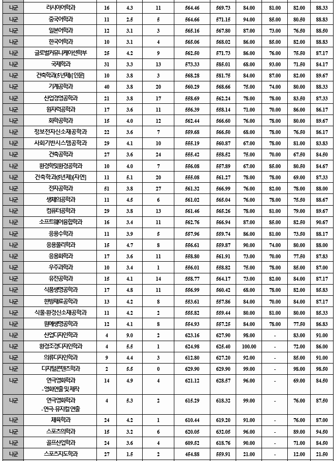 인서울 주요 대학 중 10위권내 대학인 속칭 중경외시 라인으로 부르고 있는 중앙대, 경희대, 한국외국어대, 서울시립대는 경쟁률도 치열하고 상위권 수험생들이 많이 지원하는 대학으로 수시뿐 아니라 수능 정시 등급도 1등급 이내로 높은 편입니다.