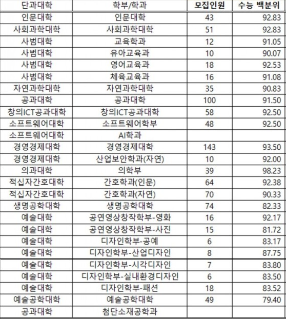 중앙대, 경희대 수능 정시등급, 백분위컷