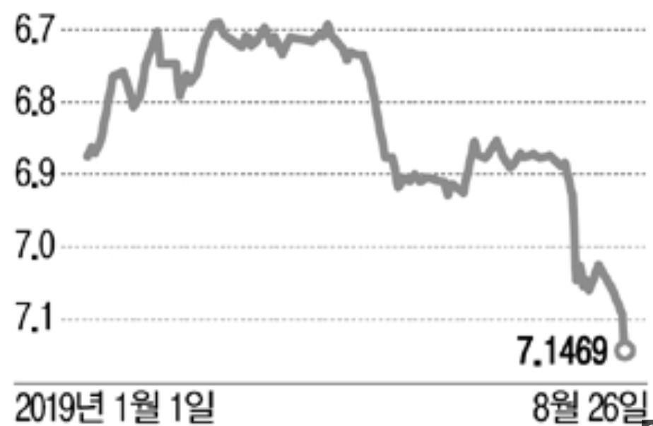 이에 중국은 강력히 반발하면서 미국농산물 구매 중단, 세계 생산량 80%에 달하는 희토류 판매 금지로 맞서고 있습니다. 그냥 당하지 않겠다는 의지와 미국을 압박할 카드를 꺼내든 것입니다. 이 두가지만 실행이 되어도 미국으로서는 미국 농가에 타격을 주고 첨단 무기를 만드는데 타격을 입을 수 있습니다. 공교롭게도 지난 8월초 미국이 3000억달러 규모의 중국산 제품에 대하여 10%의 관세를 부과하겠다는 방침을 밝히고 나서 바로 위안화의 환율 상승이 이어진 것을 보면 중국도 환율을 무기 삼아 전면전을 선포한 것이나 다름 없었습니다.