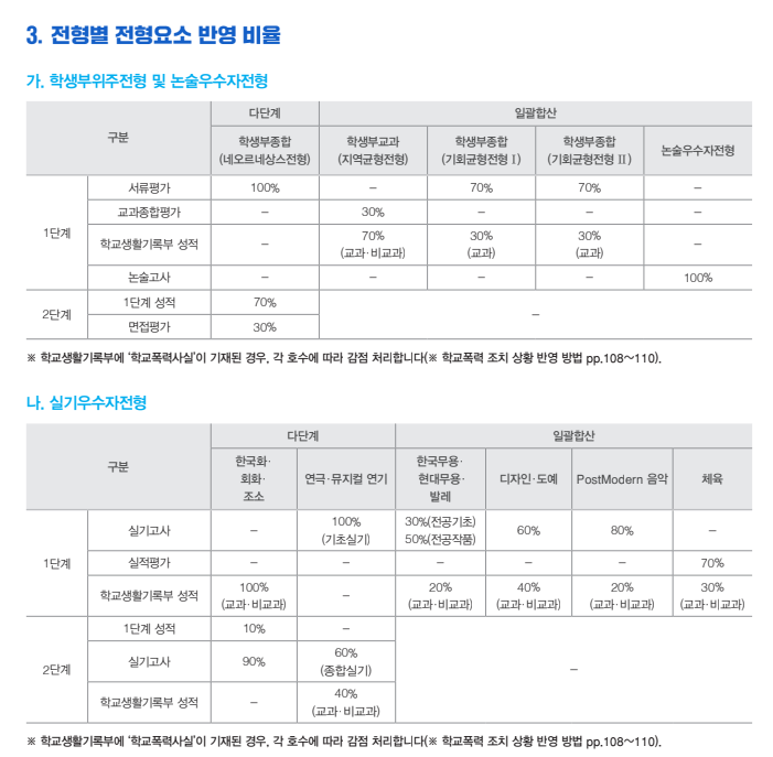 수시 모집 인원은 학생부교과(지역균형) 615명, 학생부종합(네오르네상스)1,068명, 기회균형 I 150명, 기회균형 II 90명,논술우수자 474명, 실기우수자 330명으로 총 2,727명을 선발합니다. 수능 최저학력 기준을 보면, 학생부교과(지역균형)은 인문·자연 국·수·영·탐 중 2개 영역 등급 합 6 이내 + 한국사 5등급 이내, 예·체능 국·수·영·탐 중 1개 영역 3등급 이내, 학생부종합(네오르네상스)은 수능 최저가 없으나 단, 의예과, 한의예과(인문/자연), 치의예과, 약학과: 국·수·영·탐 3개 합 4 이내 + 한국사 5등급 이내입니다. 논술우수자전형은 인문·자연: 국·수·영·탐 중 2개 영역 합 6 이내 + 한국사 5등급 이내, 예·체능 국·수·영·탐 중 1개 영역 3등급 이내입니다. 학교폭력 반영이 강화되어 모든 전형에서 생활기록부 기재 시 감점 처리됩니다. 원서 접수비는 학생부교과(지역균형) 40,000원, 학생부종합 60,000원, 논술전형 60,000원, 실기우수자전형 70,000원 ~ 100,000원 (전공별 상이)입니다.