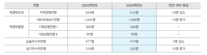 수시 모집 인원은 학생부교과(지역균형) 615명, 학생부종합(네오르네상스)1,068명, 기회균형 I 150명, 기회균형 II 90명,논술우수자 474명, 실기우수자 330명으로 총 2,727명을 선발합니다. 수능 최저학력 기준을 보면, 학생부교과(지역균형)은 인문·자연 국·수·영·탐 중 2개 영역 등급 합 6 이내 + 한국사 5등급 이내, 예·체능 국·수·영·탐 중 1개 영역 3등급 이내, 학생부종합(네오르네상스)은 수능 최저가 없으나 단, 의예과, 한의예과(인문/자연), 치의예과, 약학과: 국·수·영·탐 3개 합 4 이내 + 한국사 5등급 이내입니다. 논술우수자전형은 인문·자연: 국·수·영·탐 중 2개 영역 합 6 이내 + 한국사 5등급 이내, 예·체능 국·수·영·탐 중 1개 영역 3등급 이내입니다. 학교폭력 반영이 강화되어 모든 전형에서 생활기록부 기재 시 감점 처리됩니다. 원서 접수비는 학생부교과(지역균형) 40,000원, 학생부종합 60,000원, 논술전형 60,000원, 실기우수자전형 70,000원 ~ 100,000원 (전공별 상이)입니다.
