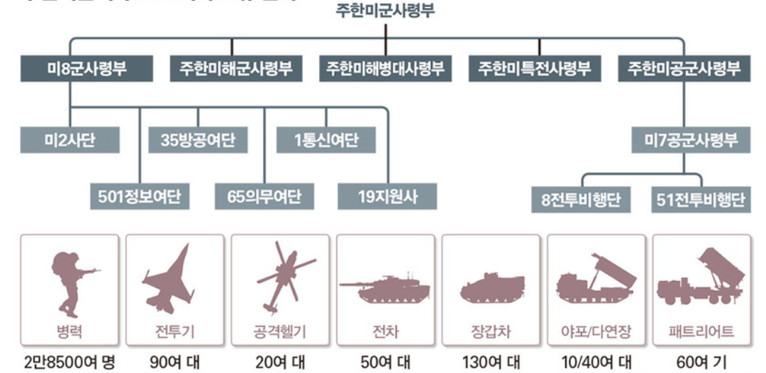 주한미군의 존재는 북한, 중국을 직접적으로 견제하는 장치입니다. 우리의 필요에 의해서도 존재하지만 그보다는 중국에 대한 견제가 더 크다고 볼 수 있겠습니다. 현재 한국에 주둔중인 미군의 규모는 28,500명 수준으로 알려져 있습니다. 주한미군의 주둔 근거는 한미상호방위조약이며 이에 따라 미군이 들어와 있는데 앞서 보았듯이 중국 견제를 위한 요충지로서 한국이 중요한 위치에 있기 때문에 대규모의 군사와 기지를 보유하고 있는 것입니다.