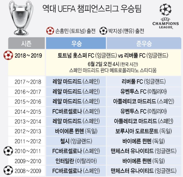 이상과 같이 챔스리그에 대해서 알아보았습니다. 이번에 특히 이목을 끄는 곳은 바로 사상 처음 결승에 오른 토트넘에 손흥민 선수가 있다는 것입니다. 예전에 맨유에서 뛰었던 박지성 선수 이후로 두번째인 셈입니다. 이번 시즌 토트넘에서 대활약을 펼쳤던 손흥민 선수가 결승골을 내준다면 더할 나위가 없을 것이고 골만 기록해도 정말 대단할 것 같습니다. 물론 출전 그 자체로도 대단한 것임은 더 말할 나위도 업습니다. 참고 역대 전적에서는 리버풀이 251514패로 토트넘을 앞서고 있습니다. 손흥민 선수는 데뷔 후 리버풀을 상대로 1골을 기록한 적도 있습니다. 이번에도 시원한 골을 터뜨려 주기를 기대해 보겠습니다.