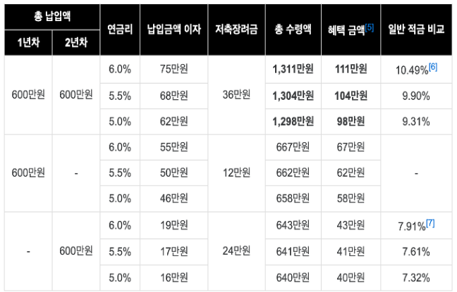 물론 장려금이 한도가 없는 것은 아니며 장려금은 최대 36만 원까지 지급되고, 가입금액은 최소 월 5만 원에서 최대 50만 원 이내에서 자유롭게 설정할 수 있습니다. 은행 이자와 비과세 혜택과 장려금을 합치면 최대 10.49%의 상당히 월등한 혜택을 받을 수 있습니다. 일반 은행에서 제시하는 금리는 6% 정도입니다.