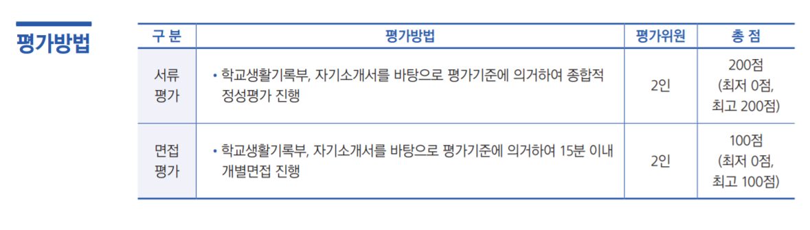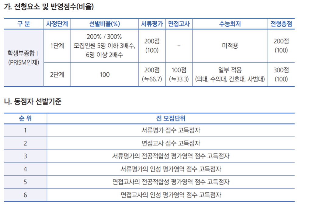 학생부 종합 중 학생부 종합 I PRISM 인재 전형은 481명, 학생부 종합 II 농어촌 학생은 108을 선발합니다. 전체로는 781명을 학생부 종합 전형으로 선발합니다. 학생부 종합 전형은 1단계 서류 100%, 2단계 서류66.7, 면접 33.3% 비중으로 면접 비율이 다소 높은 편입니다. 자기 소개서 제출은 필수입니다. 수능최저학력기준은 없으나 PRISM 인재는 의대, 수의대, 간호대, 사범대는 수능최저학력기준이 있으니 수능 준비에도 소홀히 하면 안되겠습니다. 학생부 종합 평가 기준은 전공적합성, 인성, 창의성입니다.
