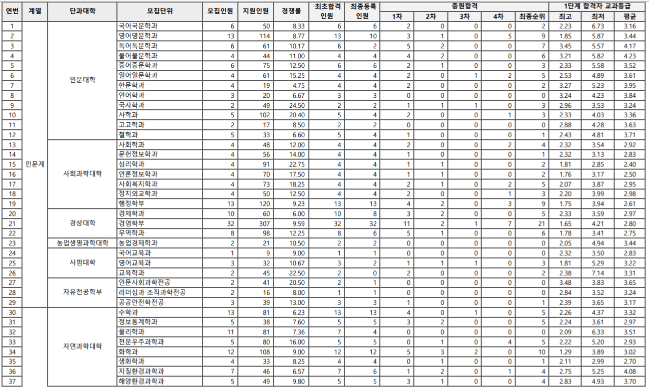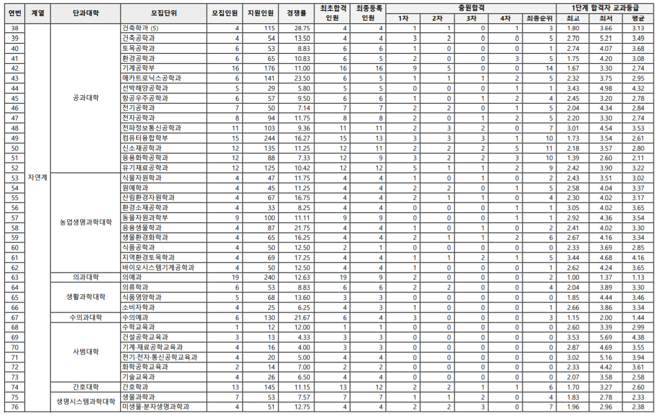 학생부교과 수시등급을 알아보겠습니다. 평균 등급 기준 인문계 인문대학은 2.74~3.98, 사회과학대학 2.28~2.97, 경상대학 2.51~3.04, 사범대1.82~2.16등급이었습니다. 자연과학대학은 2.59~3.91, 공과대학 2.05~4.15, 농업생명과학대학 2.52~3.96, 의예과 1.17, 수의예 1.56, 간호대학 2.03등이었습니다. 인문계는 2등급 중반~3등급 초반대 안정권, 자연계는 2등급 중후반~3등급 중반대로 보입니다. 기계, 전기, 전자 공학 등 주요 공과대 등급은 2등급 이내입니다.
