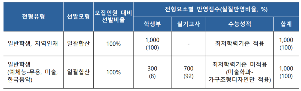 학생부교과전형은 학생부 100% 반영으로 최저학력기준을 적용합니다. 인문계열은 모집단위별로 반영하는 수능 4개 영역(국어, 수학, 영어, 탐구) 중 3개 영역의 등급 합이 지정등급 이내이며, 자연계도 같은 기준입니다. 학생부종합전형은 1단계 서류평가, 2단계 면접 30점, 서류 700점 만점 기준이며 수능최저학력기준은 없습니다.