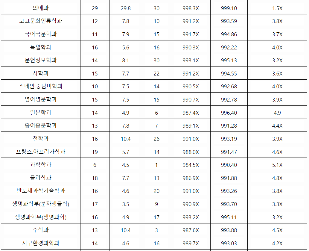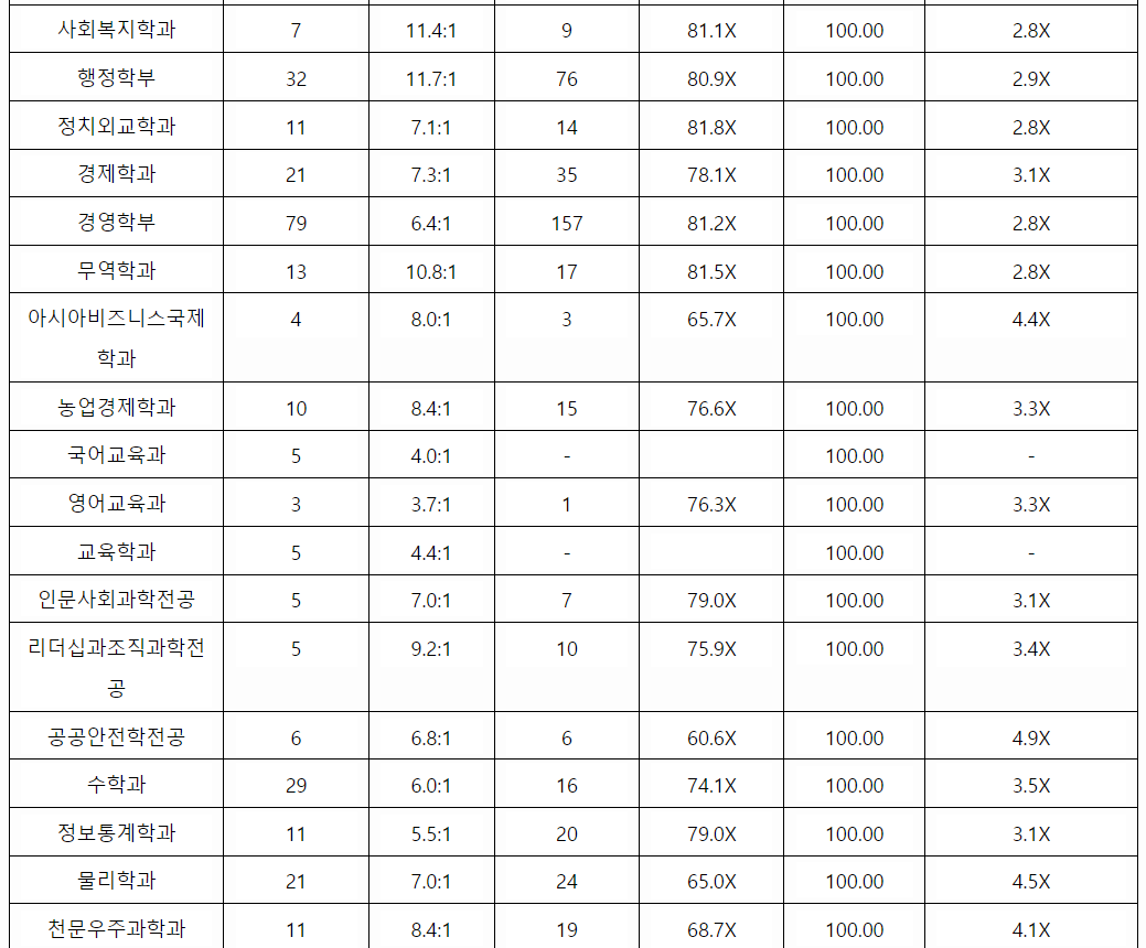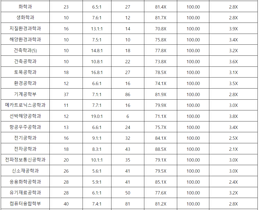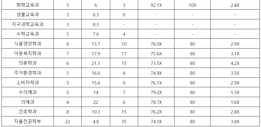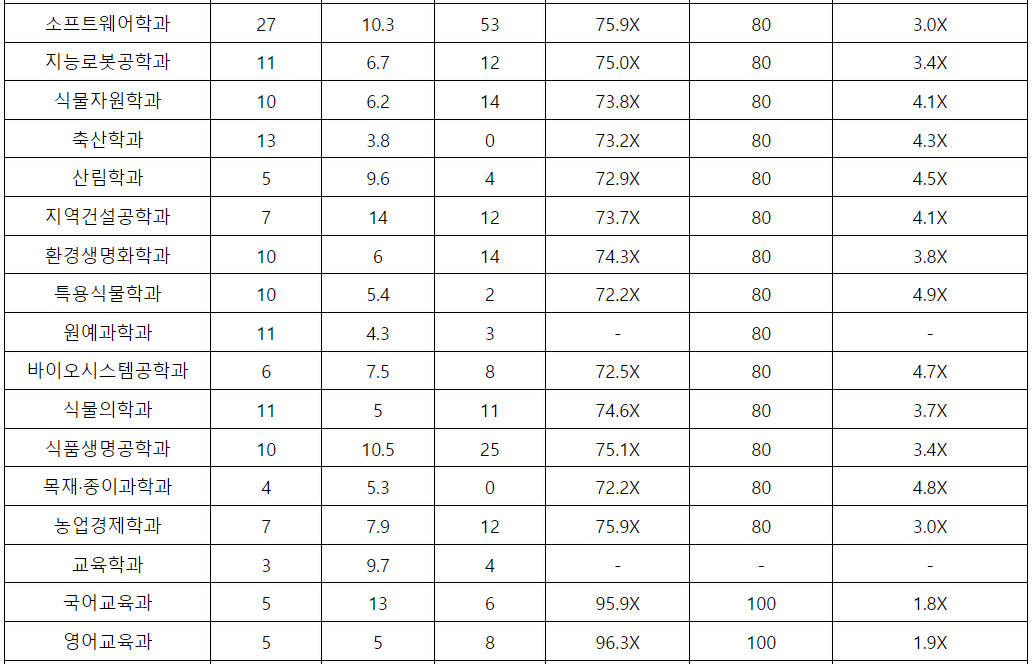 전북대 학생부 교과 일반 전형결과를 확인해 보겠습니다. 간호 2.4, 건축공학 3.8, 기계공학 3.4, 소프트웨어공학 3.8, 전기공학 2.9, 전자공학 3.6, 항공우주 3.5, 화학 공학 3.4, 조경 4.1, 역사교육 2.6, 사회복지 2.9, 사회 3.4, 행정 3.0, 경영 4.2, 의류 4.0, 수의예 1.3, 의예 1.5, 국어국문 3.7, 영어영문 3.9, 수학 4.5, 통계 3.6, 치의예 1.9 등입니다.