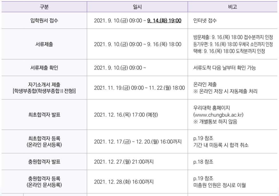 충북대 주요 수시 모집으로는 학생부종합 1, 506명, 학생부종합 2, 209명, 학생부 교과 712명, 학생부교과 지역인재전형 291명 등입니다. 수능최저 학력기준이 있는 전형은 학생부종합 학생부종합Ⅱ전형, 학생부 교과, 지역인재전형입니다. 입학원서 접수 일정은 9월 10일부터 14일까지입니다. 최초 합격자 발표는 12월 16일입니다.