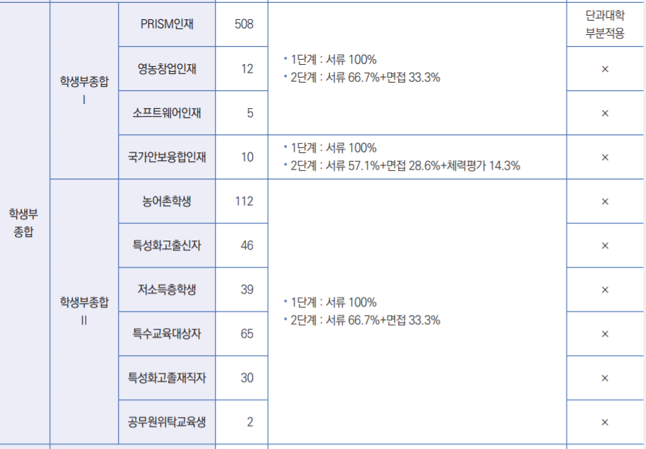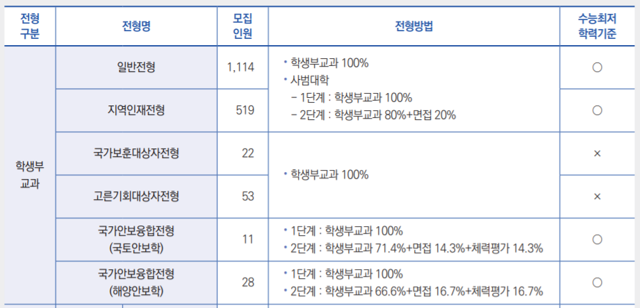 학생부종합1전형은 수능최저학력기준이 없으며 서류 평가 일괄합산입니다. 전문성, 인성, 적극성을 위주로 평가합니다. 학생부종합2전형은 수능최저학력을 적용합니다. 평가요소는 1형과 동일합니다. 학생부교과는 교과 성적 100% 반영이며 수능최저학력기준을 적용합니다.