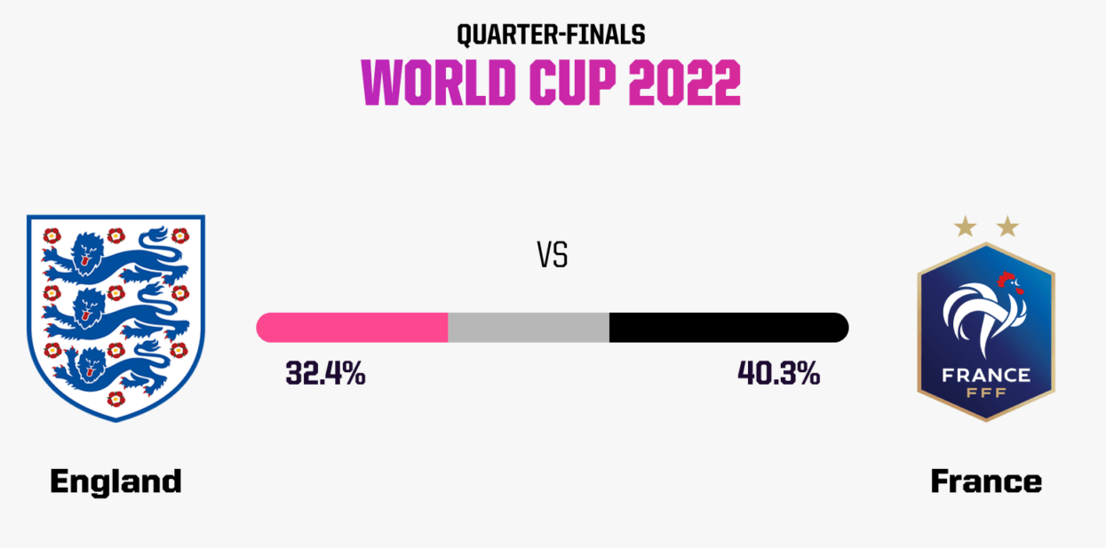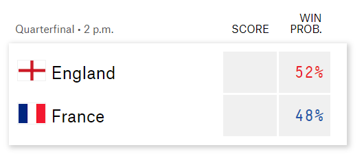 데이터 업체인 OPTA(옵타)에서 예측한 프랑스의 승률은 40.3%로 잉글랜드의 승률 32.4%보다 다소 앞서 있습니다. 팽팽한 승률을 보이고 있어 연장전이나 승부차기까지 갈 가능성이 크며 무승부로 끝날 가능성은 27.3%로 보고 있습니다. 다른 통계업체인 파이브서티에잇은 잉글랜드 승리 가능성 52%, 프랑스 48%로 역시 팽팽한 결과로 예측하고 있습니다. 55% 이상의 승부 예측 적중률을 보여주고 있는 BBC 축구 해설가 크리스 서튼도 프랑스가 2-1로 잉글랜드에 이길 것이라고 예측하고 있습니다.