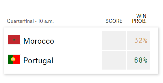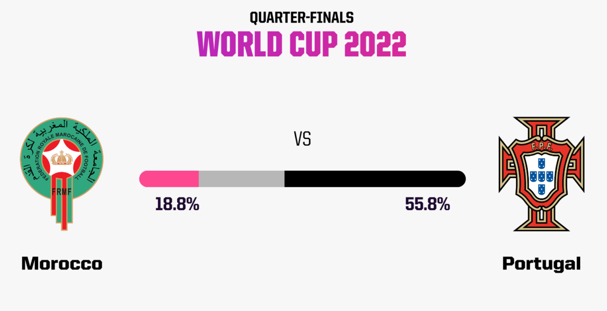 창과 방패의 싸움이 될 것 같은 두팀의 경기 예측을 보면 크리스 서튼은 모로코가 포르투갈에 1-0으로 이길 것으로 전망했다. OPTA는 포르투갈이 이기로 준결승에 진출할 확률이 55.8%로 비교적 높게 예측하고 있습니다. 모로코는 무승부와 연장전을 포함해 정규 시간에 승리할 확률이 18.8%이며 무승부 끝에 승부차기까지 갈 가능성은 25.4%로 평가됩니다. 미국 통계업체인 파이브서티에잇도 포르투갈 68%, 모로코 32%로 내다보고 있습니다. 개인적으로는 승부차기까지 갈 가능성도 커 보일 것 같은데 모로코의 체력 회복이 변수가 될 것 같습니다.
