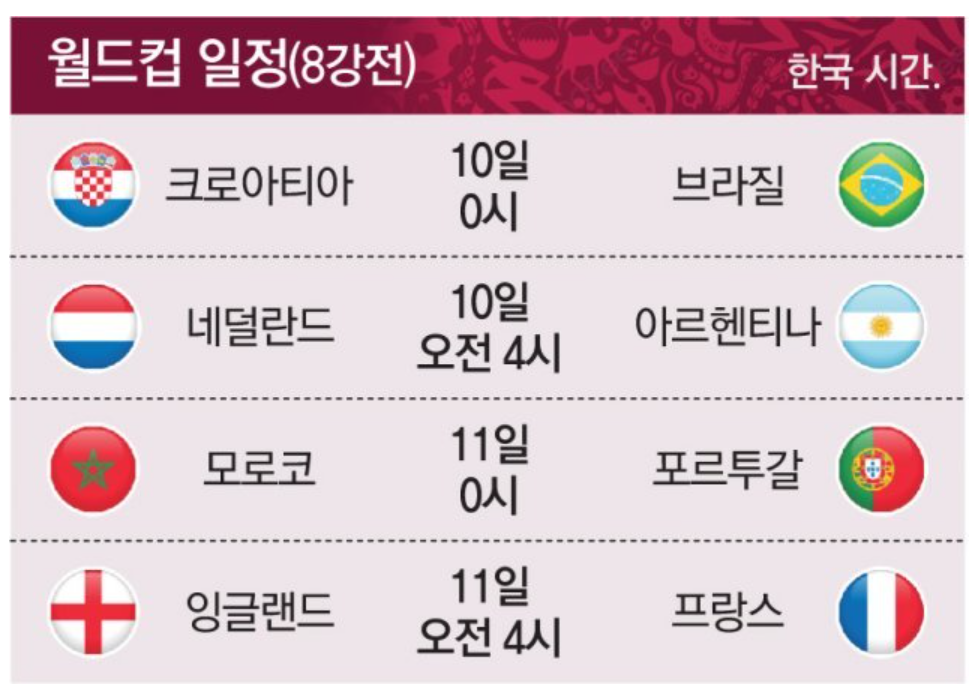 전세계 축구팬들의 관심을 끌고 있는 카타르 월드컵 8강전은 12월 10일, 11일 이틀에 걸쳐 진행될 예정입니다. 지금은 리그전이 아니라 녹아웃 단판승부이기 때문에 단두대 매치라고도 불리는 토너먼트 게임은 지면 끝이기 대문에 필사적인 대결로 이어집니다. 그만큼 손에 땀을 쥐게 만드는 명승부들도 많아 흥미를 끌게 됩니다.