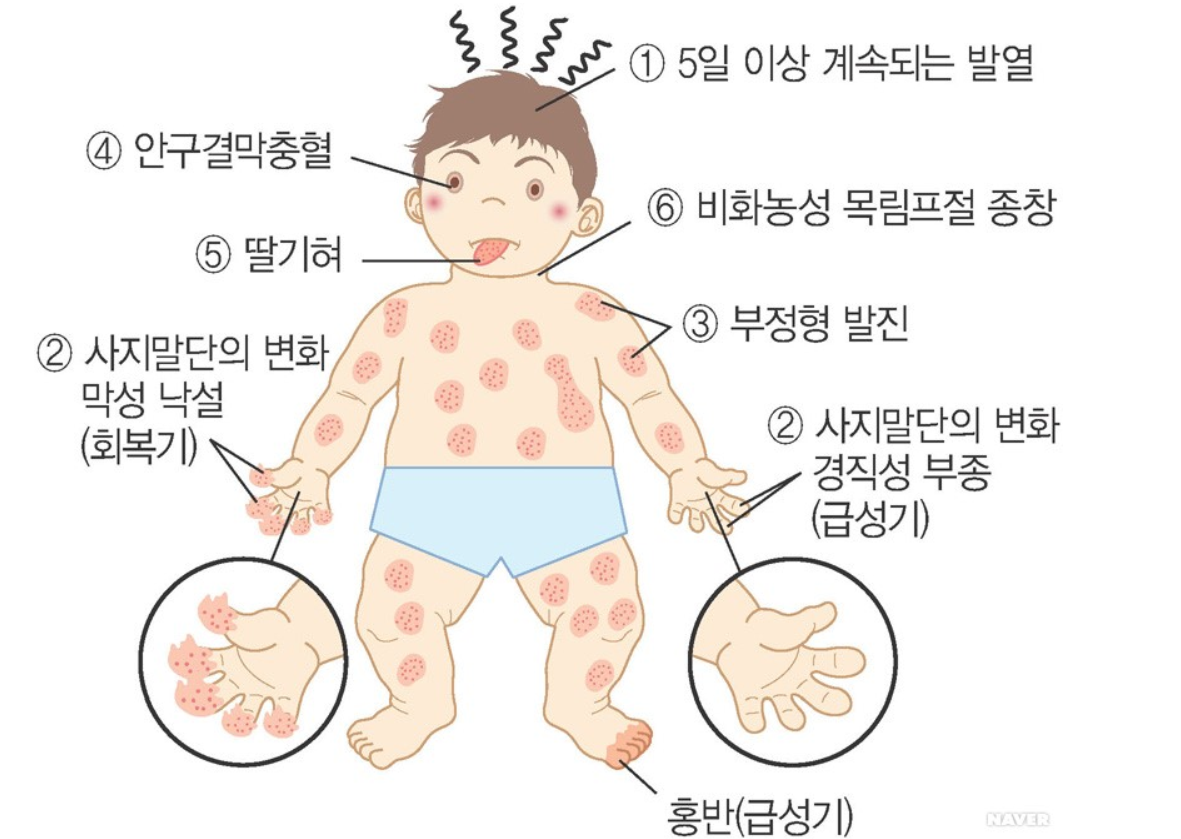 가와사키병은 만 4세 이하의 유아에게서 나타나는 급성 발열증세로 체온이 38~40도정도로 올라 가 5일 정도 지속되며 피부와 점막 림프절 계통에 특이 증상이 나타나며 안구충혈과 붉은 반점이 나오고 입술도 붓게 됩니다. 심장, 혈관, 간 쪽에 이상을 유발하고 위장관 장애, 뇌수막염으로 이어질 수도 있는 소아병입니다.