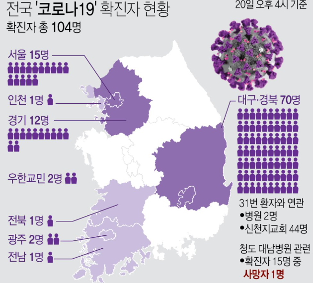 2월 20일 오후 4시 기준으로 대한민국의 코로나19 확진자 수는 104명으로 처음으로 세자리 수를 돌파했습니다. 여기에 최초로 사망자 1명까지 발생하면서 사태가 더 퍼져 나가고 있습니다. 국적별로 보면 중국이 확진자 74,578명, 사망자 2,118명, 일본 크루즈가 621명 사망자 2명, 일본 본토가 90명 사망자 1명인데, 한국이 무려 58명이나 증가하며 위험 수준으로 치닫고 있는 상태입니다. 더욱이 중국, 일본에 비하여 코로나19를 상대적으로 잘 관리하고 있다고 자부심까지 가지고 있던 상황인데 문제의 31번째 확진자가 퍼뜨린 바이러스의 영향으로 큰 파장을 일으키고 있는 상황입니다.