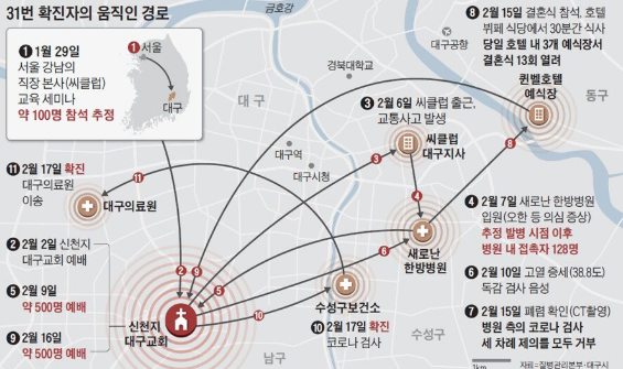 코로나19 확진자 확산의 진원지 대구 신천지 교회 위치, 코로나 31번째 확진자 동선