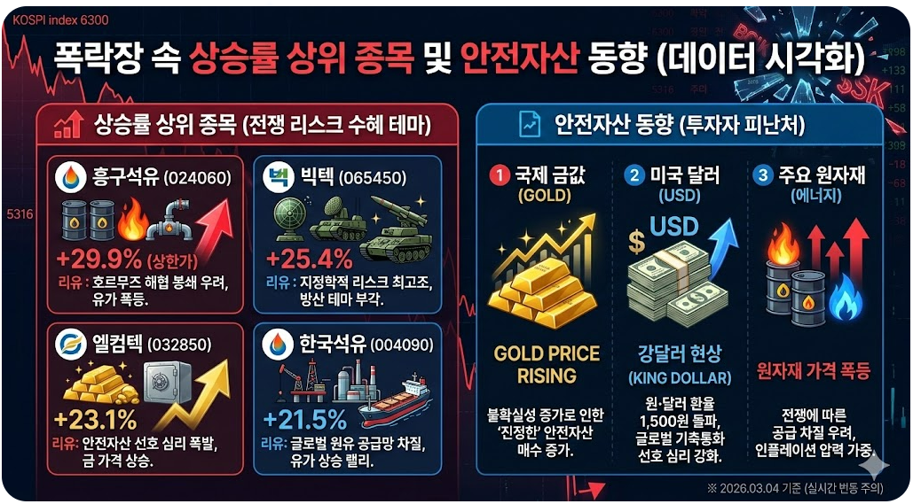 지수가 무너지는 아비규환 속에서도 전쟁 리스크를 직접적인 호재로 인식하는 특정 테마주들은 시장의 수급을 블랙홀처럼 빨아들이며 기형적인 급등세를 연출하고 있습니다. 특히 에너지 공급망 붕괴 우려와 군사적 충돌 격화에 베팅하는 투기적 자금이 집중되고 있습니다.