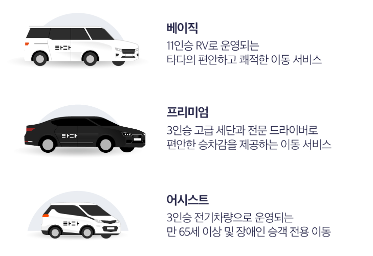 현재 타다 서비스는 승합차 카니발을 이용하여 서울 지역과 경기 일부 지역에서 영업을 계속 하고 있으며 향후 확대 운영하겠다고 밝히며 더욱 논란을 가중시키고 있습니다. 앱을 이용하여 차량을 호출하여 목적지를 설정, 이용하는 방식으로 운영되고 있습니다. 현재 차량 대수는 1,400여대 이용자는 125만명 정도로 급속히 증가하고 있습니다.