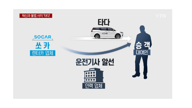이런 가운데 타다(TADA)서비스라는 승차 공유 서비스가 2018년 10월에 첫 선을 보이면서 또 다른 논란에 등장하였습니다. 타다 서비스는 11~15인승용 승합차를 렌트 차량으로 운영하면서 전문 운전 기사를 파견하는 형태로 영업을 하는 서비스입니다. 쉽게 말해서 사용자가 부르는 타다는 렌터카가 오는 것이며 기사가 같이 딸려 오는 것입니다. 렌터카가 운임을 받고 승객을 태우는 것이 불법인지 아닌지 논란이 계속되고 있는데 타다 측에서는 승차 정원 11인 이상 차량을 임차하는 경우는 운전자를 알선, 파견하는 것이 허용되어 있으므로 불법이 아니라고 주장하고 있습니다.