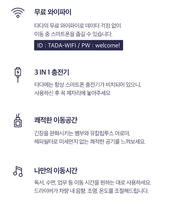 카카오 택시를 써 본 사람이라면 쉽게 이용할 수 있는데 방식은 거의 유사합니다. 앱을 설치하여 출발지와 목적지를 입력하면 근거리에 있는 타다 차량과 기사가 배차되어 서비스를 제공하게 됩니다. 결제도 간편하여 앱에 미리 카드를 등록해 놓으면 자동 결제되는 방식입니다. 차량은 자동으로 배치되므로 승차 거부는 차단하였다고 합니다. 무료 와이파이와 충전기 서비스가 함께 제공됩니다. 현재 출발지 기준 서울시 전 지역, 인천시 전 지역(계양 1,3동, 옹진군, 강화군 제외), 경기도 성남시 분당구, 과천시에서 서비스를 이용할 수 있습니다. 이용 가능 시간은 24시간이며 11인 탑승 차량이지만 7명까지 탑승을 권장하고 있습니다.