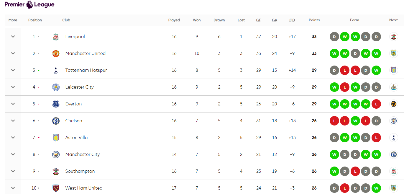 이날 3-0 승리를 거둔 토트넘은 정규리그 16경기에서 그동안 이어진 4경기 무승(2무 2패)의 부진을 끝내고 7위에서 3위(승점 29)로 순위가 급상승하였습니다. 선두 리버풀(승점 33), 2위 맨체스터 유나이티드(승점 33)와 의 승점 차이는 4점 차로 줄었습니다. 토트넘으로서는 매우 귀중한 승리를 챙기며 다시 상위권으로 도약한 것입니다. 토트넘의 현재 기록은 8승 5무 3패입니다.