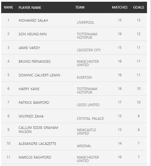 토트넘에서 환상의 궁합을 이루고 있는 해리 케인은 10골을 기록하며 6위에 올라 있습니다. 10위까지 순위를 살펴 보면 3위는 레스터시티의 제이미 바디, 맨유 브루노 페르난데스, 에버턴 도미닉 칼버트 르윈 이상 11골, 공동 6위 리즈 패트릭 뱀버트, 8위 뉴캐슬 칼럼 윌슨, 크리스탈 팰리스 윌프레드 자하 8골, 10위 아스널 알렉상드르 라카제트, 맨유 마커스 래쉬포드 7골입니다.