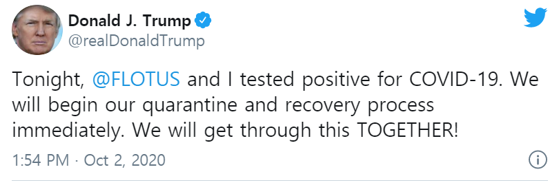 올해 74세인 트럼프는 고령의 나이이며 비교적 위험한 연령층에 속하는 나이라 코로나로 인한 후유증, 합병증 등으로 인하여 자칫 좋지 않은 상황에 놓이지 않을까 우려되는 상황으로 세계는 더욱 불확실성의 상황으로 들어갈 수도 있습니다. 더욱이 대선을 불과 한 달여 앞두고 있으며 대선토론도 아직 두 번이나 남아 있는데 제대로 일정을 소화하기는 어려워 보여 대선 판세에도 큰 영향을 줄 것으로 보입니다.