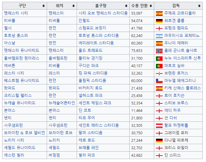 먼저 프리미어리그에 대하여 간략하게 살펴 보겠습니다. 프리미어리그는 잉글랜드축구협회가 운영하는 자국의 축구리그입니다. 최상위 20개팀이 모여 있는 리그로 1부리그격인 수준 높은 리그입니다. 시즌 개막은 8월초에 시작하여 이듬해 5월까지 팀 당 38게임을 치릅니다. 프리미어리그는 유럽 축구리그에서도 손에 꼽히는 리그로 이탈리아 세리에A, 스페인 라리가, 독일 분데스리그와 더불어 4개 리그로 불리고 있습니다. 이름을 대면 알만한 유명한 선수들과 감독들이 프리미어리그를 거쳐 갔거나 현재도 활약하고 있습니다.