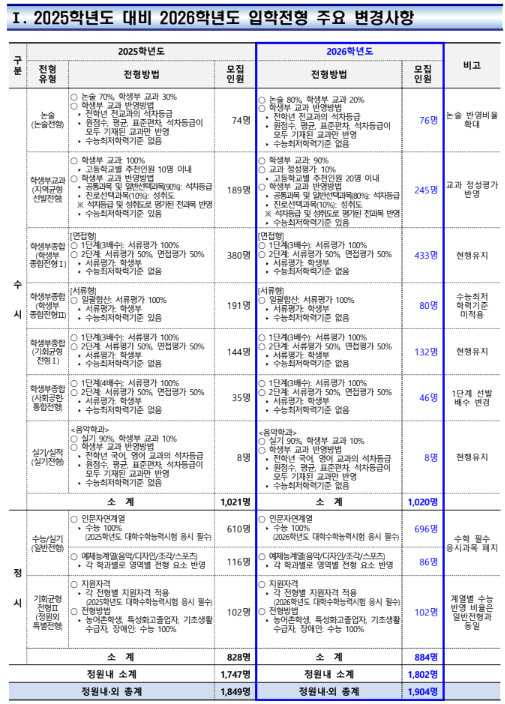 수시 모집 인원 총 모집인원(정원내)은 1,020명으로, 논술 76명, 학생부교과(지역균형) 245명,학생부종합Ⅰ(면접형) 433명,학생부종합Ⅱ(서류형) 80명,기회균형Ⅰ132명,사회공헌·통합 46명,실기 8명입니다. 수능 최저학력 기준의 경우 논술전형 적용 없으며,학생부교과(지역균형)는 국어(택1), 수학(택1), 영어, 탐구(상위 1과목) 중 3개 합 8 이내 + 한국사 4등급 이내, 학생부종합Ⅰ·Ⅱ, 기회균형, 사회공헌·통합은 적용하지 않습니다. 주요 변경 사항으로 논술전형 논술 반영비율 70% → 80% 확대, 학생부 반영 30% → 20% 축소,학생부교과(지역균형)은 교과 100% → 교과 90% + 교과 정성평가 10% 반영,추천인원 10명 → 20명으로 확대, 학생부종합Ⅱ(서류형)는 수능 최저 폐지로 변경입니다. 원서 접수비는 논술전형 65,000원,학생부교과(지역균형) 40,000원,학생부종합Ⅰ(면접형) 75,000원 (1단계 불합격 시 35,000원 환불),학생부종합Ⅱ(서류형) 40,000원, 학생부종합(기회균형, 사회공헌·통합) 75,000원 (70,000원 감면 → 5,000원 납부 가능),실기전형 90,000원입니다.
