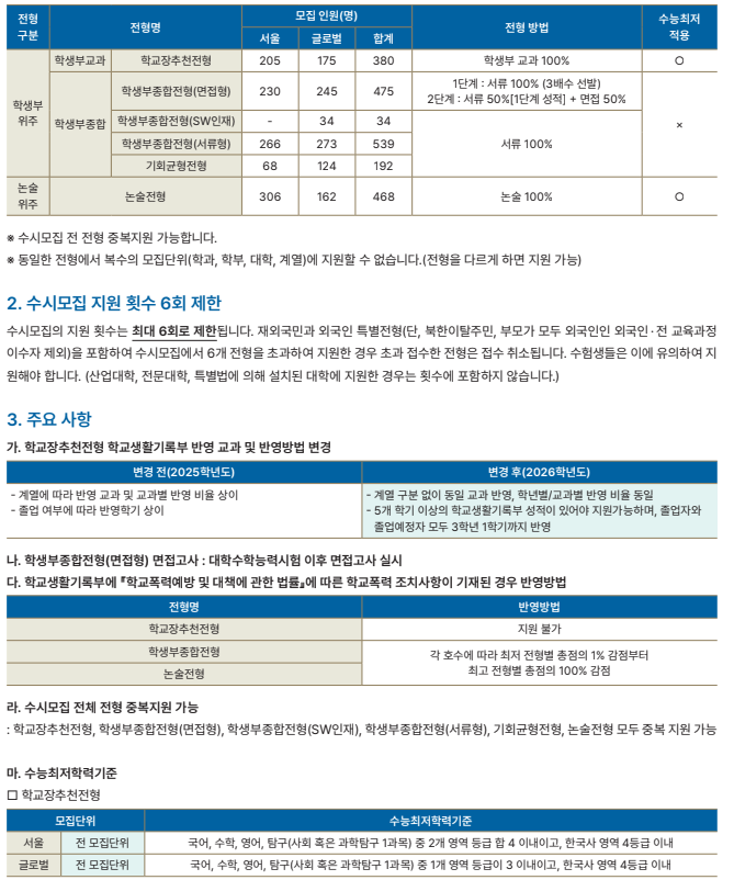 수시 모집 인원 총 모집인원(정원내)은 1,020명으로, 논술 76명, 학생부교과(지역균형) 245명,학생부종합Ⅰ(면접형) 433명,학생부종합Ⅱ(서류형) 80명,기회균형Ⅰ132명,사회공헌·통합 46명,실기 8명입니다. 수능 최저학력 기준의 경우 논술전형 적용 없으며,학생부교과(지역균형)는 국어(택1), 수학(택1), 영어, 탐구(상위 1과목) 중 3개 합 8 이내 + 한국사 4등급 이내, 학생부종합Ⅰ·Ⅱ, 기회균형, 사회공헌·통합은 적용하지 않습니다. 주요 변경 사항으로 논술전형 논술 반영비율 70% → 80% 확대, 학생부 반영 30% → 20% 축소,학생부교과(지역균형)은 교과 100% → 교과 90% + 교과 정성평가 10% 반영,추천인원 10명 → 20명으로 확대, 학생부종합Ⅱ(서류형)는 수능 최저 폐지로 변경입니다. 원서 접수비는 논술전형 65,000원,학생부교과(지역균형) 40,000원,학생부종합Ⅰ(면접형) 75,000원 (1단계 불합격 시 35,000원 환불),학생부종합Ⅱ(서류형) 40,000원, 학생부종합(기회균형, 사회공헌·통합) 75,000원 (70,000원 감면 → 5,000원 납부 가능),실기전형 90,000원입니다.