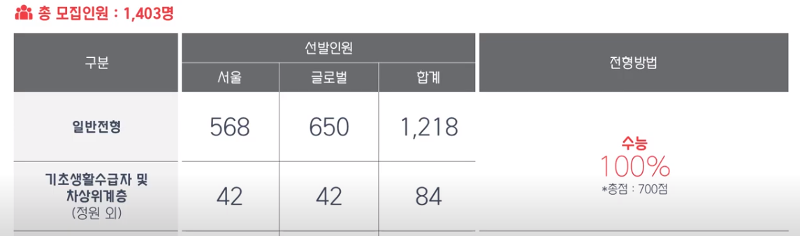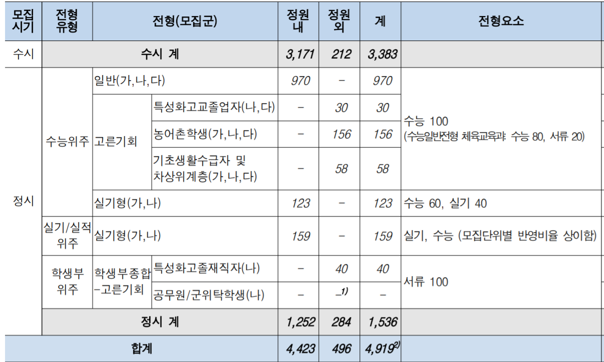 정시모집 선발인원은 650명입니다. 가, 나, 다 군으로 세분화되어 있으니 정시모집 지원 시 입시요강을 잘 확인하시기 바랍니다. 정시모집 수능 반영 비율은 인문계 국어 30%, 수학 30%, 영어 20%, 탐구 20%, 자연계 국어 20, 수학 35, 과탐 30, 영어 15 비율입니다.