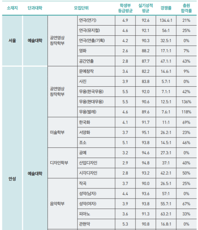 중앙대학교 안성캠퍼스는 자연계 생명공학대학, 예술대학, 스포츠과학부, 예술공학대학, 첨단소재공학과 등이 개설, 운영되고 있습니다. 인문계열 대학은 없으며 자연계, 예체능계만 있습니다. 수시모집으로 학생부교과전형, 학생부 종합전형, 논술 전형 등이 있습니다.