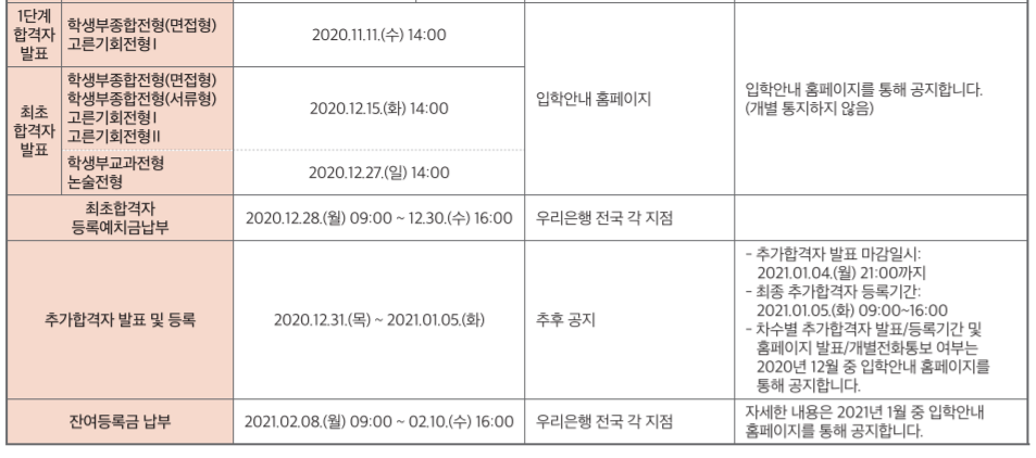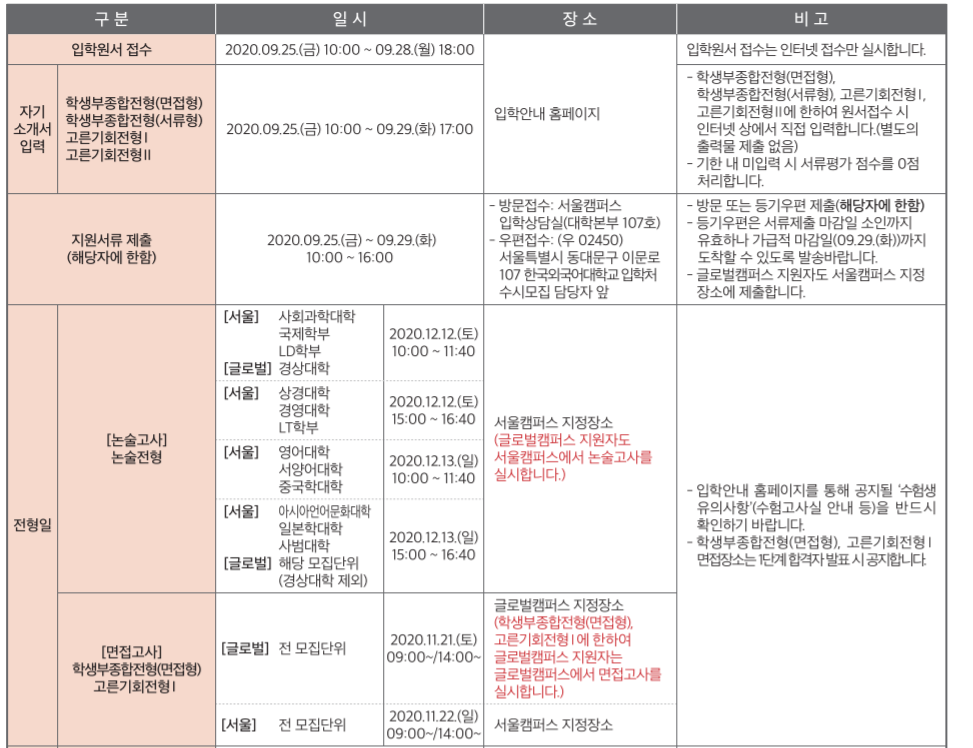 이 계획은 학교가 발표한 기존 계획이었는데 초유의 코로나 19 확산으로 인하여 학사 일정에 차질이 생긴 점을 감안하여 학종 전형은 면접을 실시하지 않고 100% 서류형으로 실시하기로 수정 발표하였으니 참고하시면 되겠습니다. 코로나로 인하여 이동이 자유롭지 않은 상황을 감안한 조치인 것으로 이해됩니다.