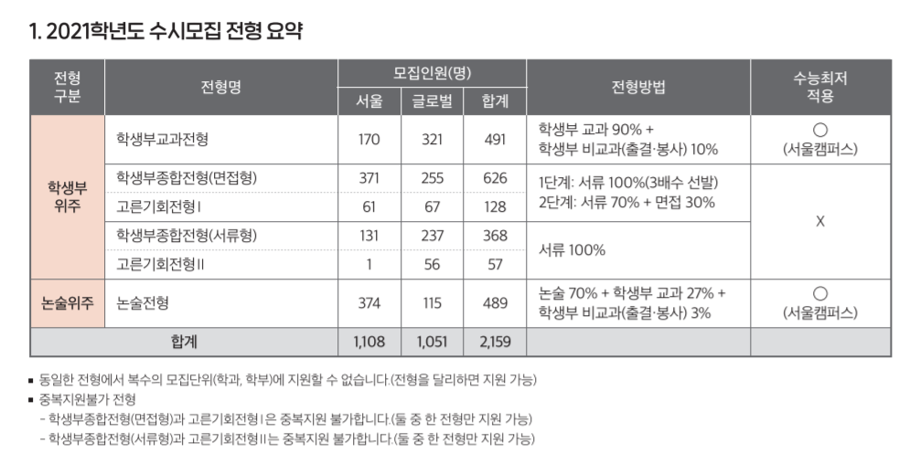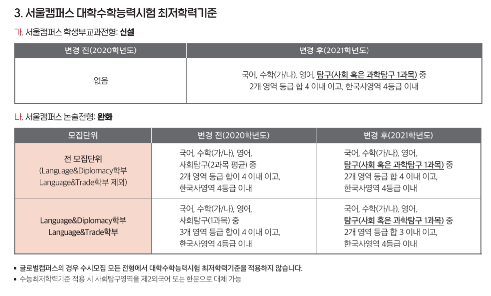 변화된 내용 중에 눈여겨봐야 할 것은 학생부 교과전형에서 서울 캠퍼스는 수능최저기준이 적용된다는 것입니다. 논술 전형에서도 서울 캠퍼스는 수능 최저기준이 있습니다. 학교가 발표한 최저 기준은 국,영, 수, 탐구(1과목) 중 2개 영역 등급의 합이 4 이내여야 하며 한국사 영역은 4등급 이내에 들어야 합니다. 논술 전형에서도 LD/LT 학부를 제외한 나머지 사울 캠퍼스 학과도 동일한 기준이 적용됩니다. LD/LT학부는 2개 영역 등급의 합이 3이내로 다소 높습니다. 사회 탐구 영역은 제2외국어나 한문으로 대체도 가능합니다.