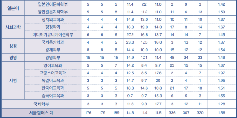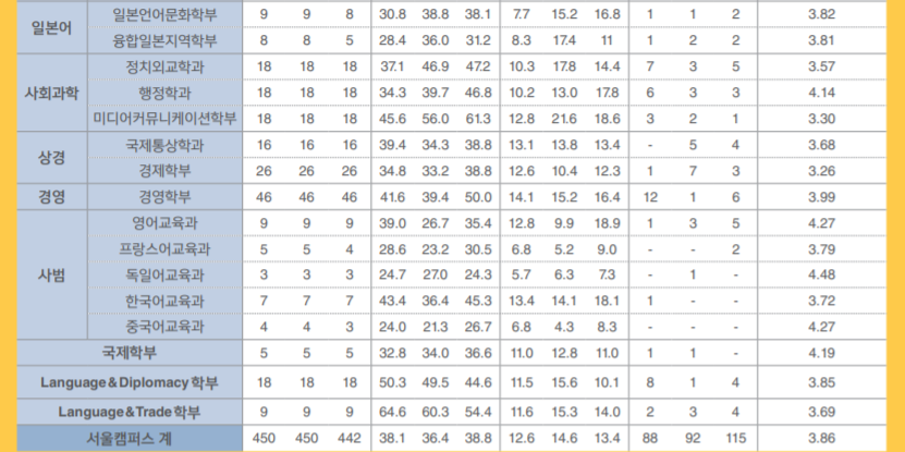 학생부 종합 전형은 서울 캠퍼스는 몽골어과 같이 3.8등급도 있지만 대개의 경우 2등급 이내에 들어야 합니다. 평균 등급은 1.5~2.5 정도입니다. 물론 교과에 비하여 학생부 기재 사항으로 다양하게 평가하는 점을 감안해야겠습니다. 논술 전형의 경우는 평균 등급 3.86등급이며 4등급 이내에서 노려 볼 수 있어 논술에 자신이 있다면 도전해 볼 만합니다. 다만 논술 전형은 수시최저 기준이 있으므로 수능을 소홀히 하면 안되겠습니다.