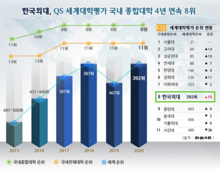 각종 대학 평가에서 비교적 좋은 평가를 받고 있는데 잘 알려져 있는 QS대학평가에서 2020년 기준, 종합 대학 순위에서 한국에서는 8위를 기록하며 4년째 10위권 내에 들어가고 있습니다. 서울대를 비롯한 한양대, 경희대, 성균관대 등의 상위권 대학이 자연계와 의예과가 강세인 점을 감안하면 인문계만으로도 이렇게 상위권에 올라 가 있어 주목 받고 있습니다. 세간의 대학 평가에서는 소위 서연고, 서성한, 중경외시라 하여 10위권 내 상위권 대학으로 분류되는데 국제적인 평가도 크게 차이가 나는 것 같지는 않습니다. 참고로 QS 대학평가 순위에서 외대는 세계 500위안에 들며 392위를 기록했으며 뒤를 이어 중앙대 403위, 동국대, 가톨릭대 456위, 서강대가 490위를 기록했습니다. 500위 안에 이름을 올린 대학교는 서울대, 연세대, 고려대, 성균관대, 한양대, 이화여대, 경희대, KAIST, 포스텍, 지스트 등을 포함하여 총 15개 대학입니다.