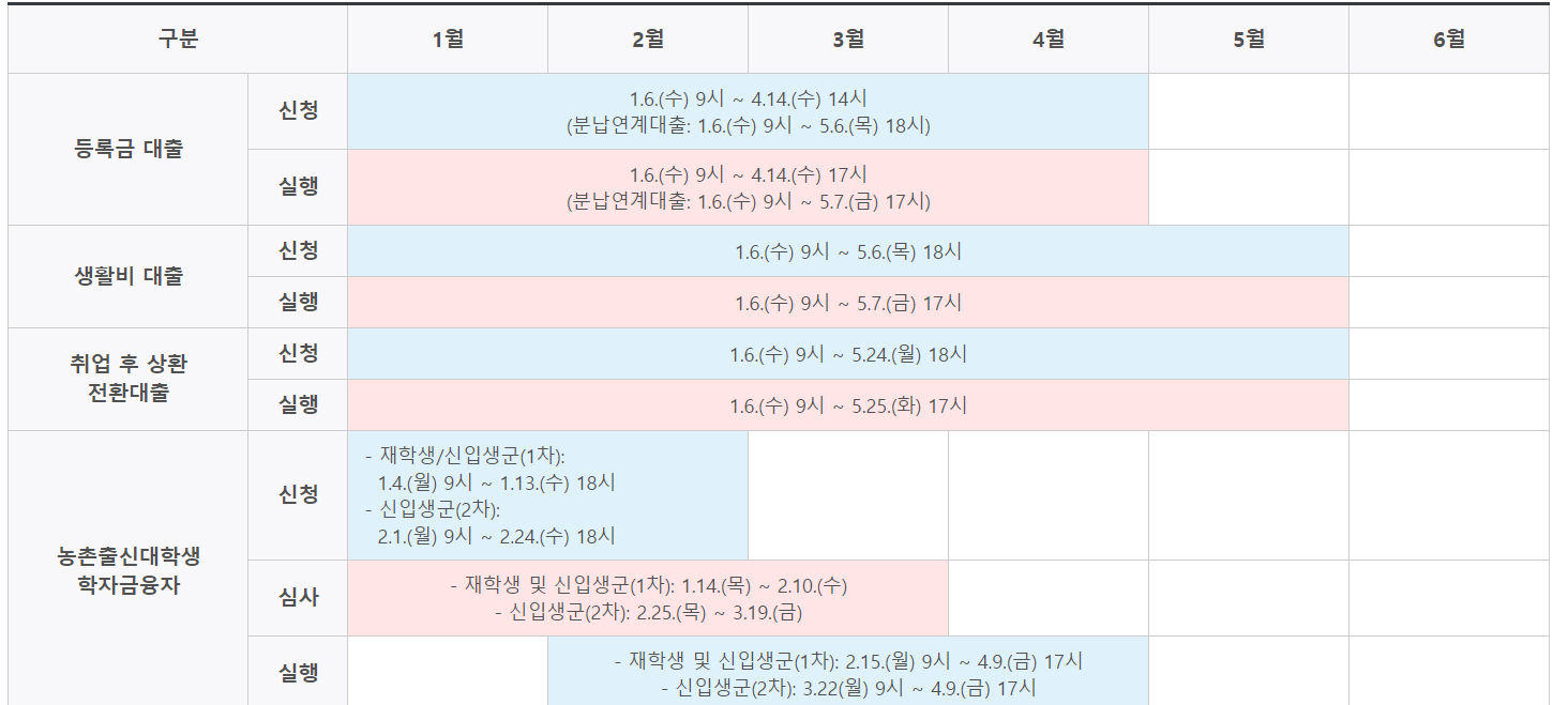 신청 기간은 등록금 대출은 1월 6일부터 시작되었으며 4월 14일 14시까지입니다. 생활비 대출은 1월 6일부터 5월 6일까지입니다. 대출을 받기 위하여 은행접속을 위한 공인인증서를 발급하고 대출 신청서 작성, 온라인 금융교육 이수, 가구원 정보제공 동의(학부생), 가족정보관련 서류 제출 등의 절차 진행후 심사를 거쳐 대출이 실행됩니다. 대출 실행 기간은 신청 기간중 이뤄집니다.